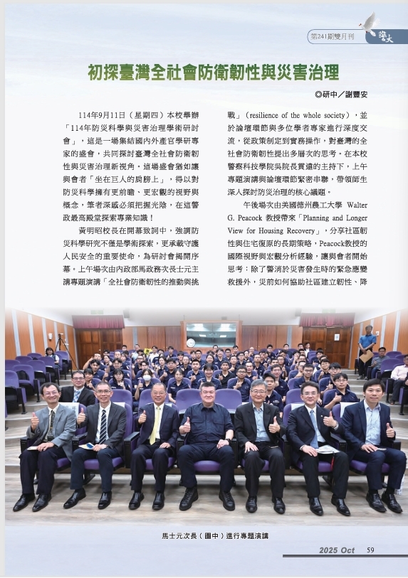 本所碩一同學謝豐安於「114年防災科學與災害治理學術研討會」撰寫的會後記(刊登於第 59–60 頁)成功投稿 警大雙月刊,整理了研討會中對 全社會防衛韌性與災害治理的觀察與思考。恭喜豐安同學的投稿成果,也感謝他將研討會重點整理成文字分享,讓更多人得以了解防災治理的最新動向。